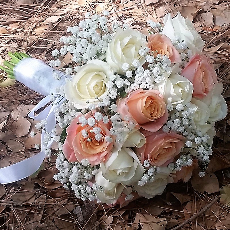 זר כלה מורדים בצבע אפרסק ולבן בשילוב גיבסניות
